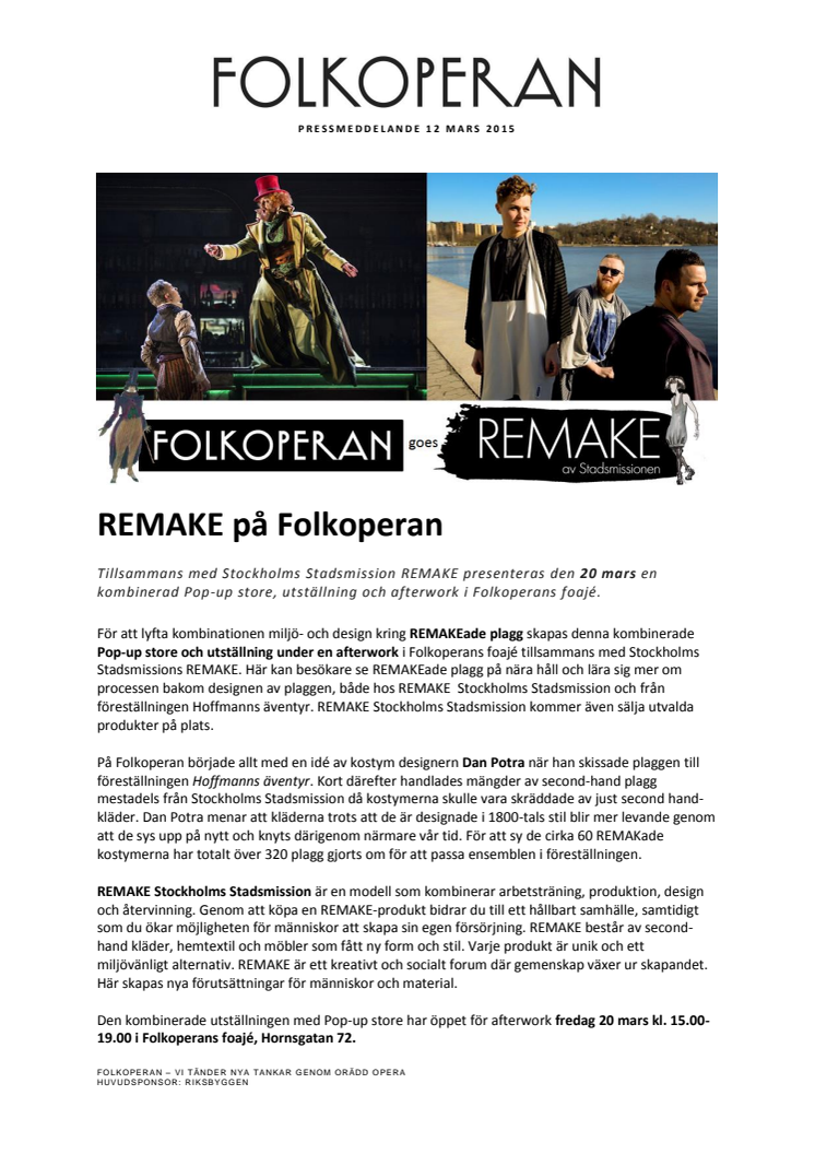 Tillsammans med Stockholms Stadsmission REMAKE presenteras den 20 mars en kombinerad Pop-up store, utställning och afterwork i Folkoperans foajé.