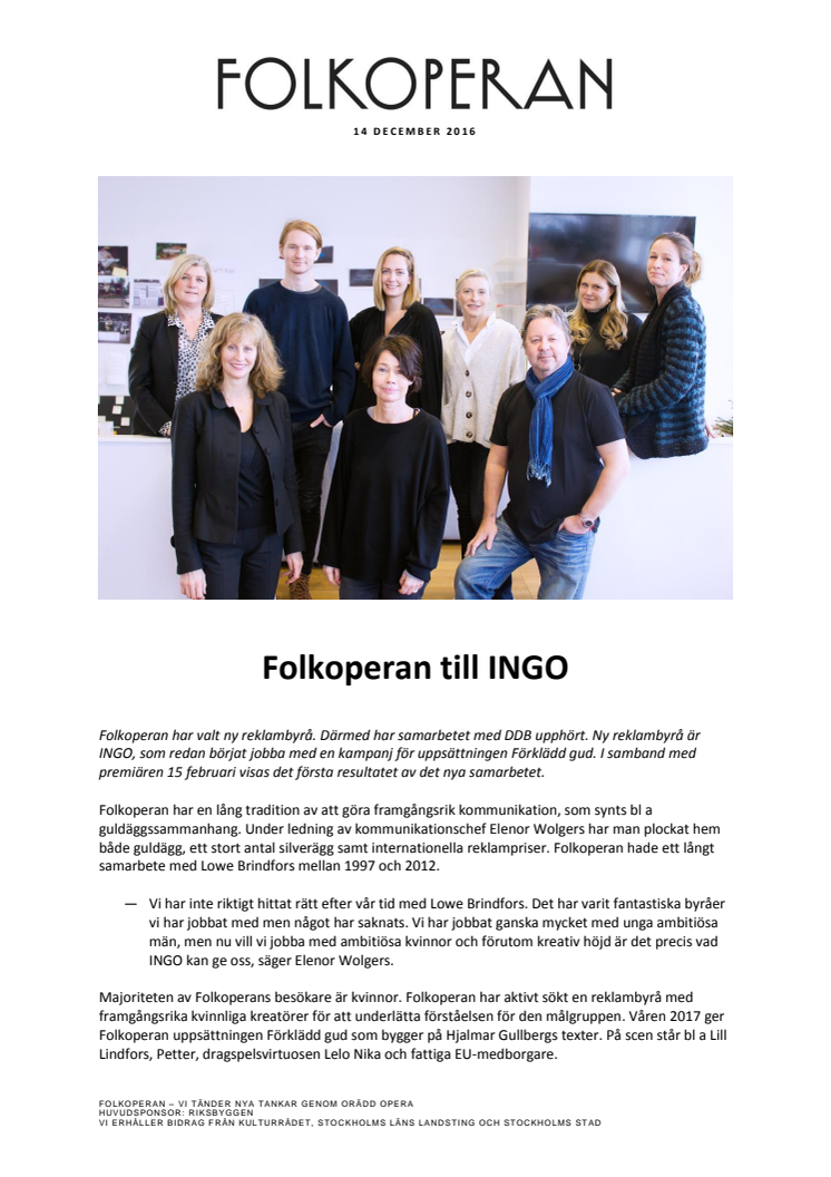 Folkoperan har valt ny reklambyrå med främst kvinnliga kreatörer i teamet. Byrån heter INGO och har redan börjat jobba med kampanjen för Förklädd gud. I samband med premiären 15 februari visas det första resultatet av det nya samarbetet.
