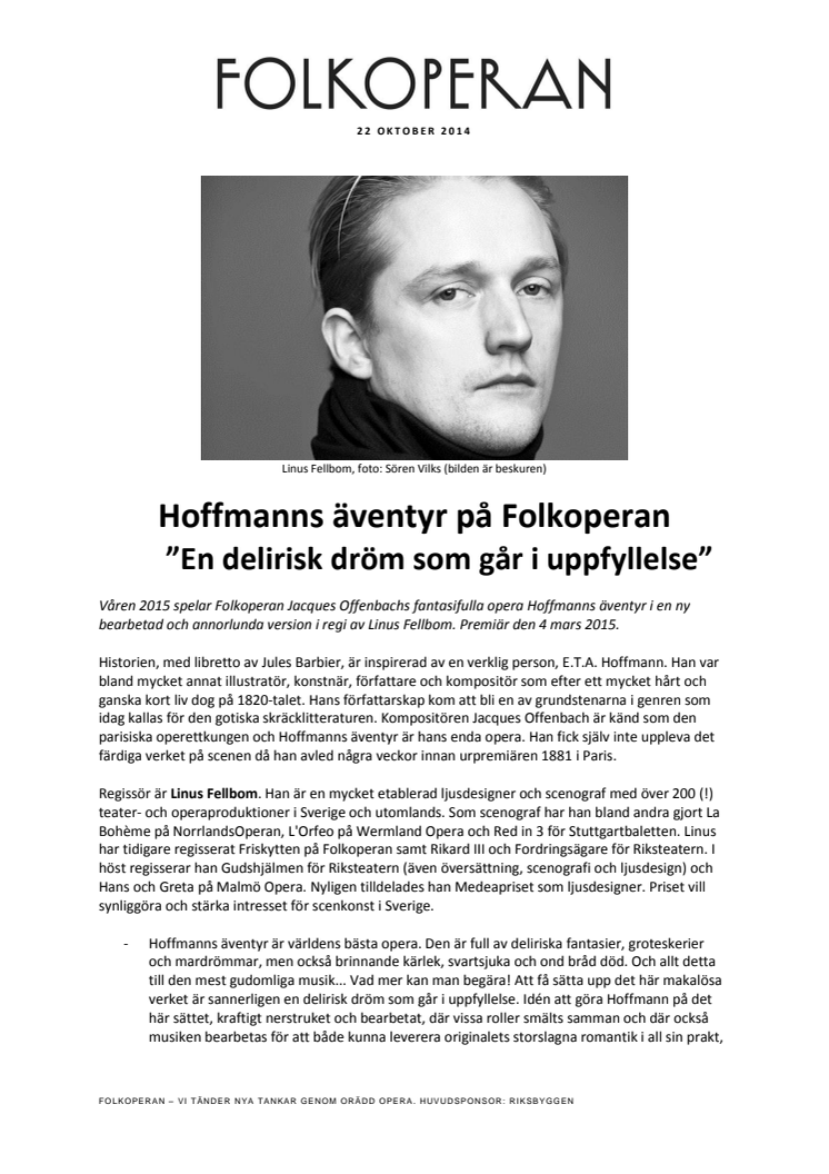 Den 4 mars har Folkoperan premiär på Jacques Offenbachs fantasifulla opera Hoffmanns äventyr av Jacques Offenbach. För regissören Linus Fellbom är det en delirisk dröm som går i uppfyllelse. i denna nya, musikaliskt bearbetade och annorlunda version med nya klangvärldar. Storslagen romantik möter klezmer, tango och chanson och för musikbearbetningen ansvarar Jonas Dominique.