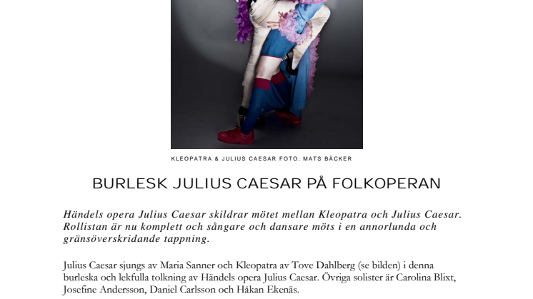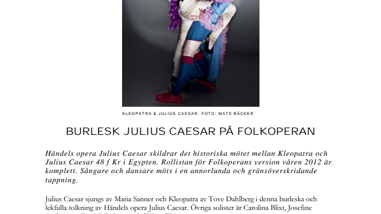 Julius Caesar sjungs av Maria Sanner och Kleopatra av Tove Dahlberg (se bilden) i denna burleska och lekfulla tolkning av Händels opera Julius Caesar. Övriga solister är Carolina Blixt, Josefine Andersson, Daniel Carlsson och Håkan Ekenäs.