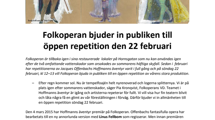 - –Efter regn kommer sol. Nu är tempelfoajén helt nyrenoverad och logerna splitternya. Vi är på plats igen efter sommarens vattenskador, säger Pia Kronqvist, Folkoperans VD. Teamet i Hoffmanns äventyr är igång och artisterna repeterar för fullt. Vi vill visa hur fin teatern blivit och låta några få en glimt av vår föreställningen i förväg. Därför bjuder vi in allmänheten till en öppen repetition söndag 22 februari.